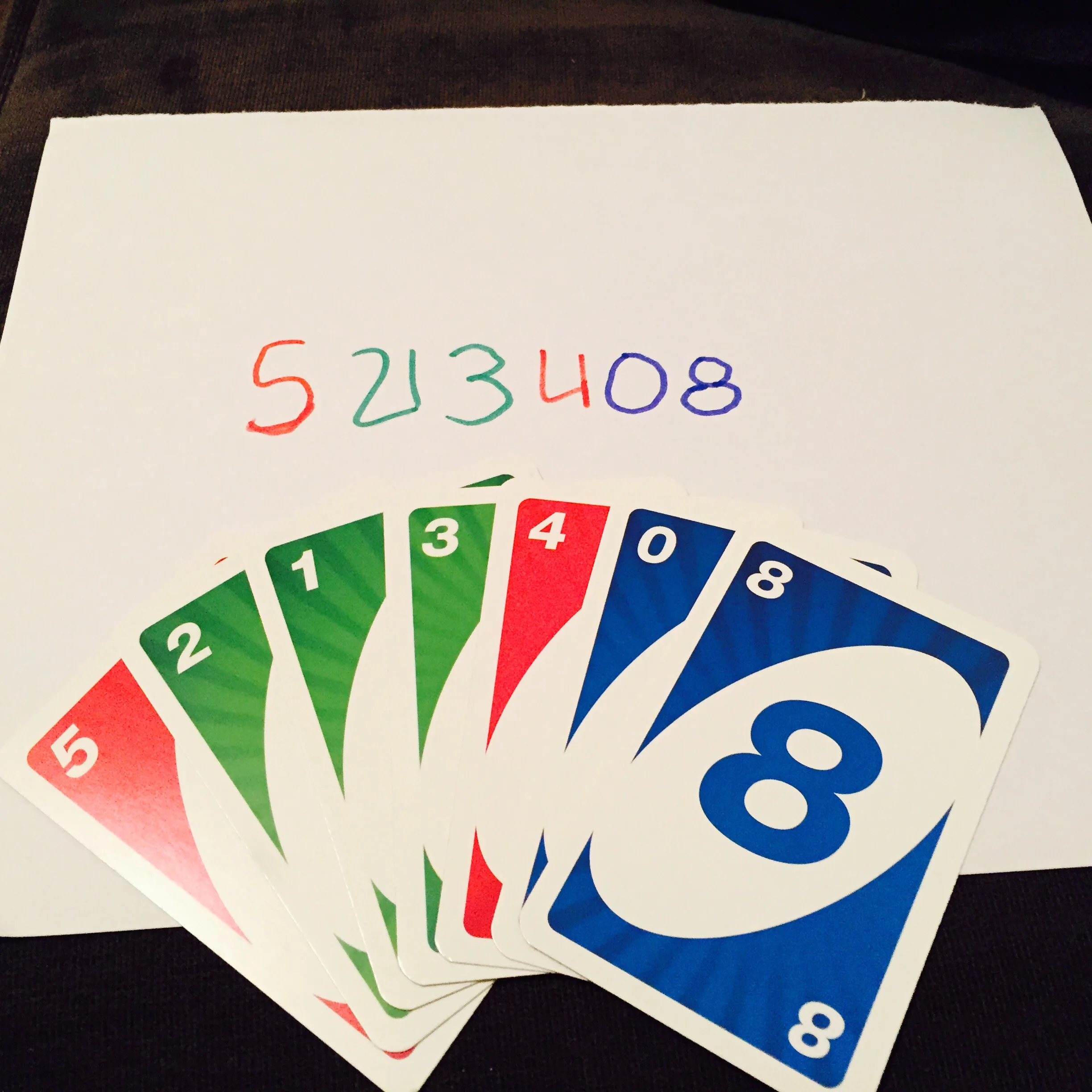 When she's done shuffling you hand her the folded up piece of paper to hold onto. Then you tell her to deal you both a hand of uno (7 cards).