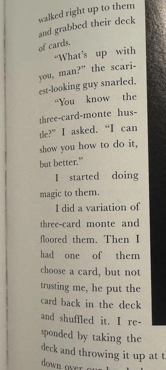 And it looks extra corny because it’s a clearly fake story that you thought made you look cool. “I crossed the color barrier and charmed the homies with my sleight of hand!” When you tell the story in your book, you even have the judge saying something like, “Are you the magician everyone’s talking about?!” lol. It’s essentially autoerotic fan fiction for how much you’re blowing yourself here.
